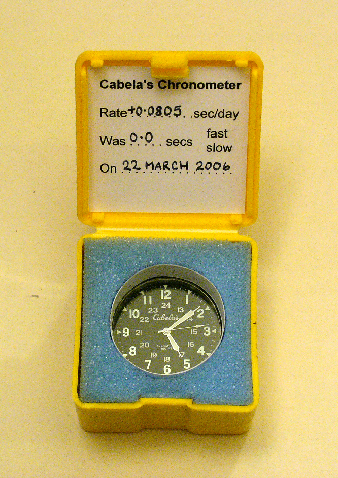 My chronometer was a small quartz analogue movement pocket watch sold by Cabela's sporting goods shop in the USA. It tells the time and nothing but the time, in the manner of all good chronometers. It has a stainless steel body, the "watch glass" is made of saphire and it will not leak with 50 metres of water on top of it. So it is a pretty rugged little time piece. Never-the-less, I put it into a small box surrounded by sponge.