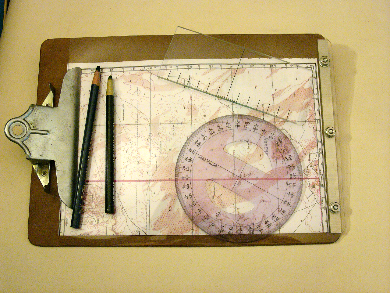 At sea, on large ships and small boats, a chart table is available to lay out the chart and plot the position. In a small tent in the middle of the Sahara desert, some ingenuity is required to devise something that will serve as a chart table. My solution was a clipboard, onto which I had attached a piece of stiff, clear plastic sheeting. The map was folded in half and with the clip on the clipboard lifted, the map was slid under the plastic sheet with the appropriate side face up. With the clip down, the map was nicely clamped in place.