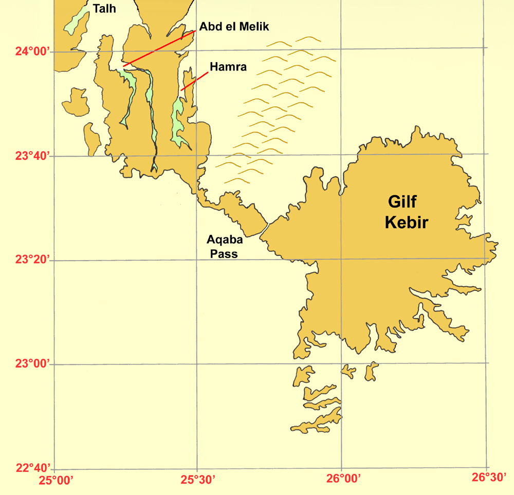 It turned out that the wadis that the Clayton expedition had located were Wadi Abd el Melik and Wadi Hamra. By common consent today, the three wadis associated with Zerzura are Talh, Abd el Melik and Hamra. But this actually makes four green valleys, as Wadi Abd el Melik has two arms, now called Wadi Abd el Melik East and West. It could be argued that from a camel herders point of view, the three valleys of Talh, with Abd el Melik East and West, form a natural group as Hamra is a couple of days journey away on the other side of the plateau.